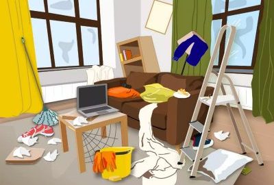 Aruncați o privire la imaginea de mai sus. Ea arată o cameră de zi care are nevoie de o curățenie generală. Sunt haine aruncate pe podea și pe mobilă, perne de canapea scoase din loc și tablouri cocoțate pe perete. Există, de asemenea, o scară, o găleată și mănuși de cauciuc în centrul camerei, ceea ce sugerează că proprietarii sunt ocupați cu curățenia generală.