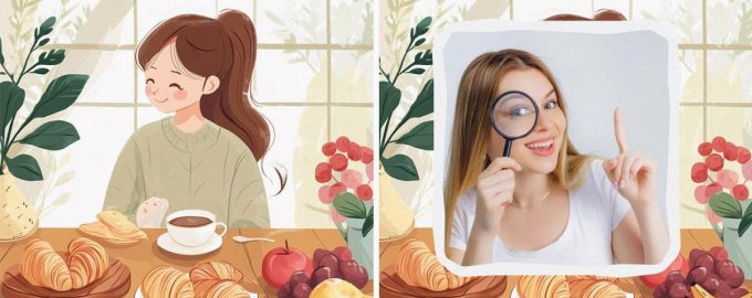 Imaginile arată o fată drăguță care savurează micul dejun în bucătăria ei. Ea bea cafea (sau ceai) cu croissante delicioase. Iar pentru desert, ea este așteptată să aibă fruiti. Imaginile par aproape identice, cu patru diferențe subtile între ele. Veți reuși să le găsiți?