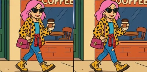 În ambele imagini vedem o fată cu părul roz care merge pe stradă ținând o cafea în mână.