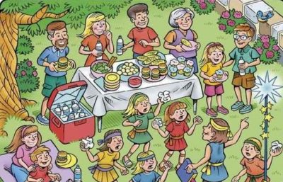 În imagine vedem o scenă interesantă – o familie numeroasă reunită pentru un picnic și care se distrează în aer liber. Adulții pun mâncare pe masă, în timp ce copiii joacă diverse jocuri distractive.