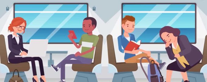 Imaginea prezintă patru persoane într-un tren, fiecare făcând ceva diferit.